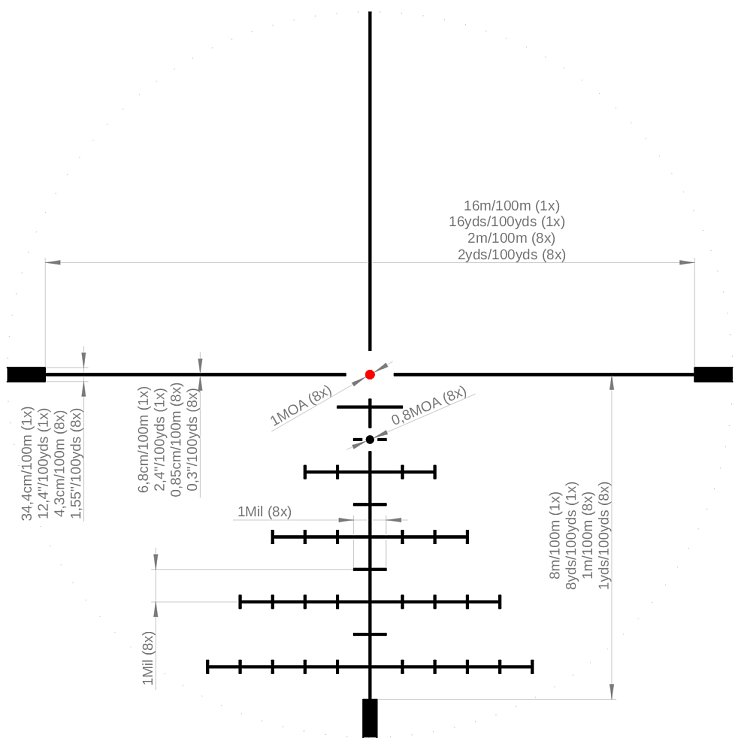 Сетка расположена во второй фокальной плоскости, поэтому ее размер остается постоянным при любом увеличении. На 1x она обеспечивает быстрый захват цели, а на 8x не перекрывает мелкие детали. Это оптимальное решение для спортивной стрельбы и загонной охоты.
